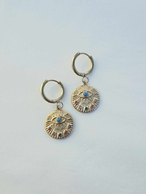 Boho hoops σκουλαρικια σε σχέδιο ματιού και πολύχρωμες φυσικές ημιπολύτιμες πέτρες zircon. Κατασκευάζονται από 100% ανοξείδωτο ατσάλι.