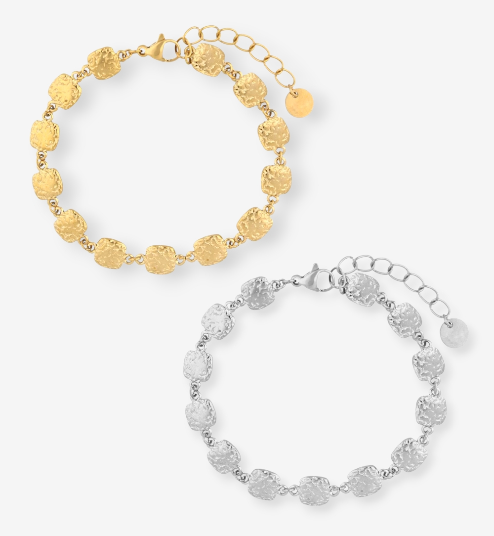 Ένα εντυπωσιακό βραχιόλι με ιδιαίτερα περιμετρικά στοιχεία με σφυρήλατο εφέ. Κατασκευαζεται από 100% ανοξείδωτο ατσάλι και επιχρύσωση 16Κ.