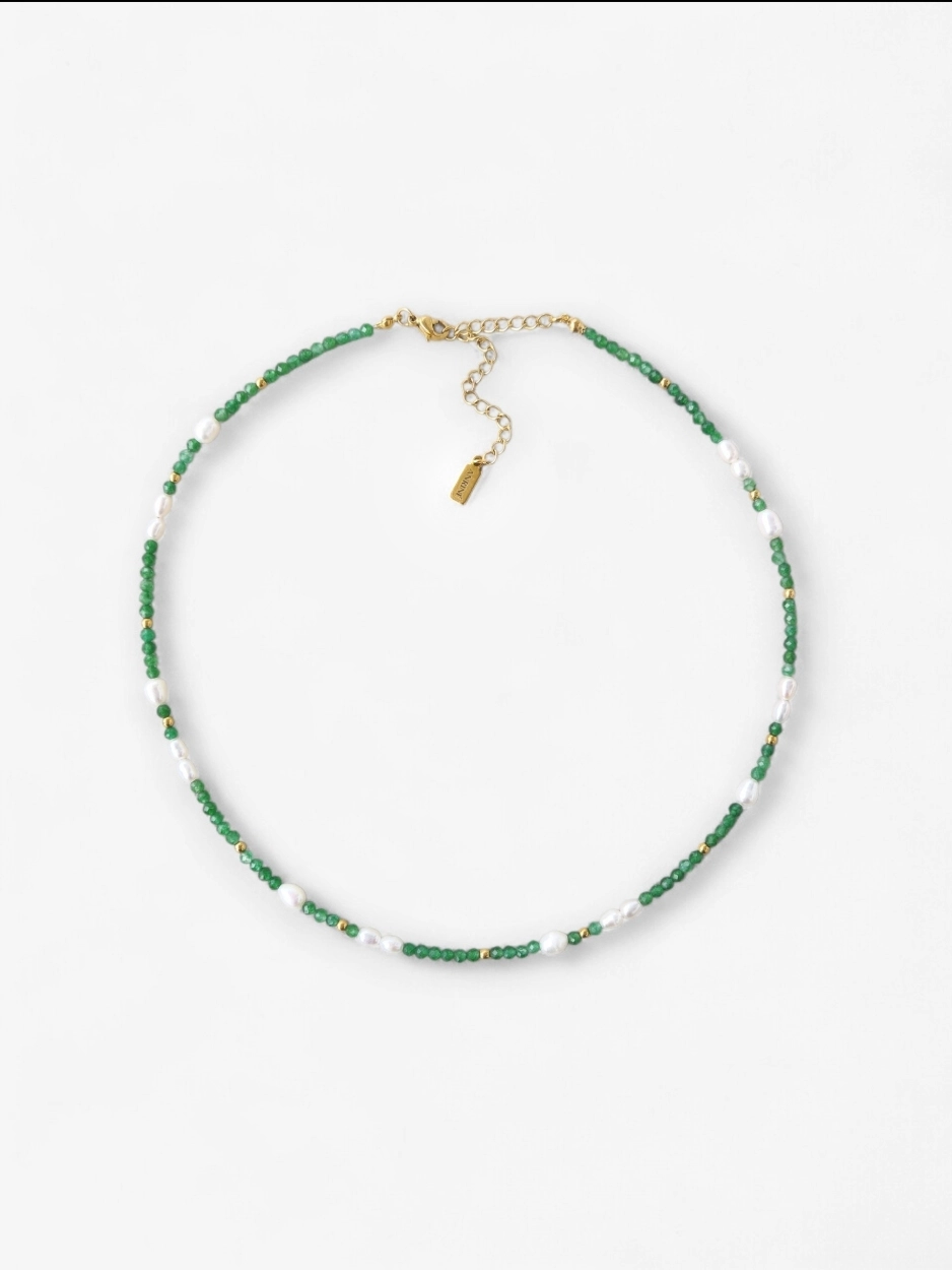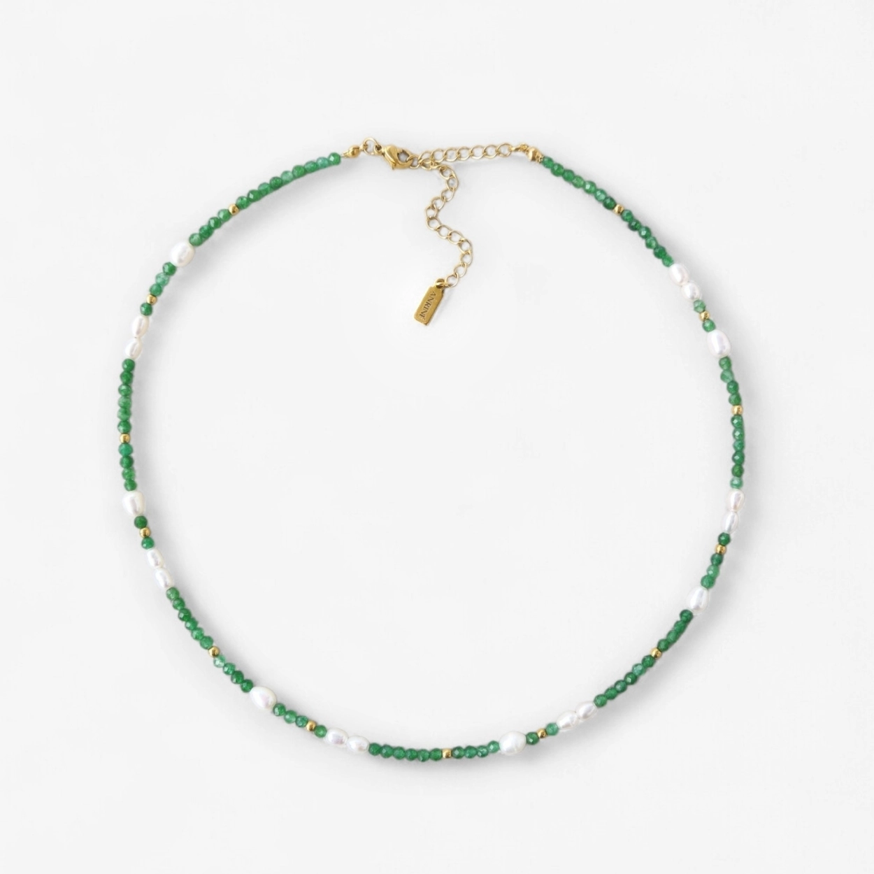 Υλικό: Ημιπολύτιμες φυσικές πέτρες αβεντουρίνης & αιματίτη, φυσικές πέρλες γλυκού νερού, ανοξείδωτο ατσάλι