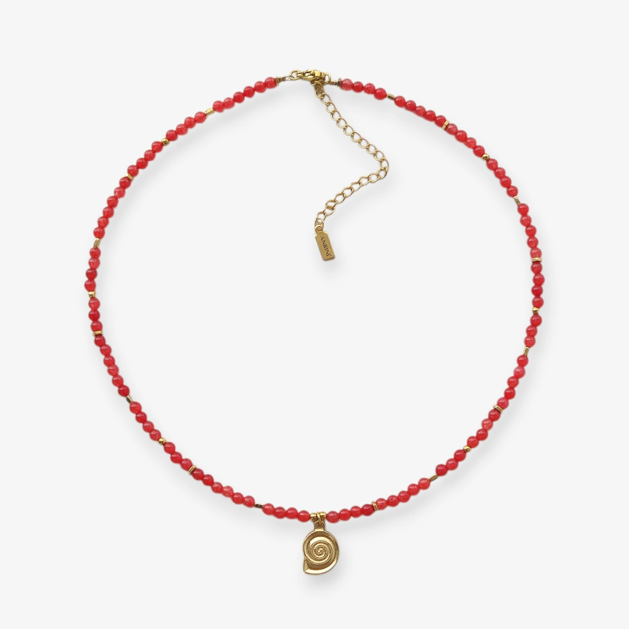 Χειροποίητο κόκκινο κολιέ με κοχύλι κρεμαστό και φυσικές ημιπολύτιμες πέτρες.