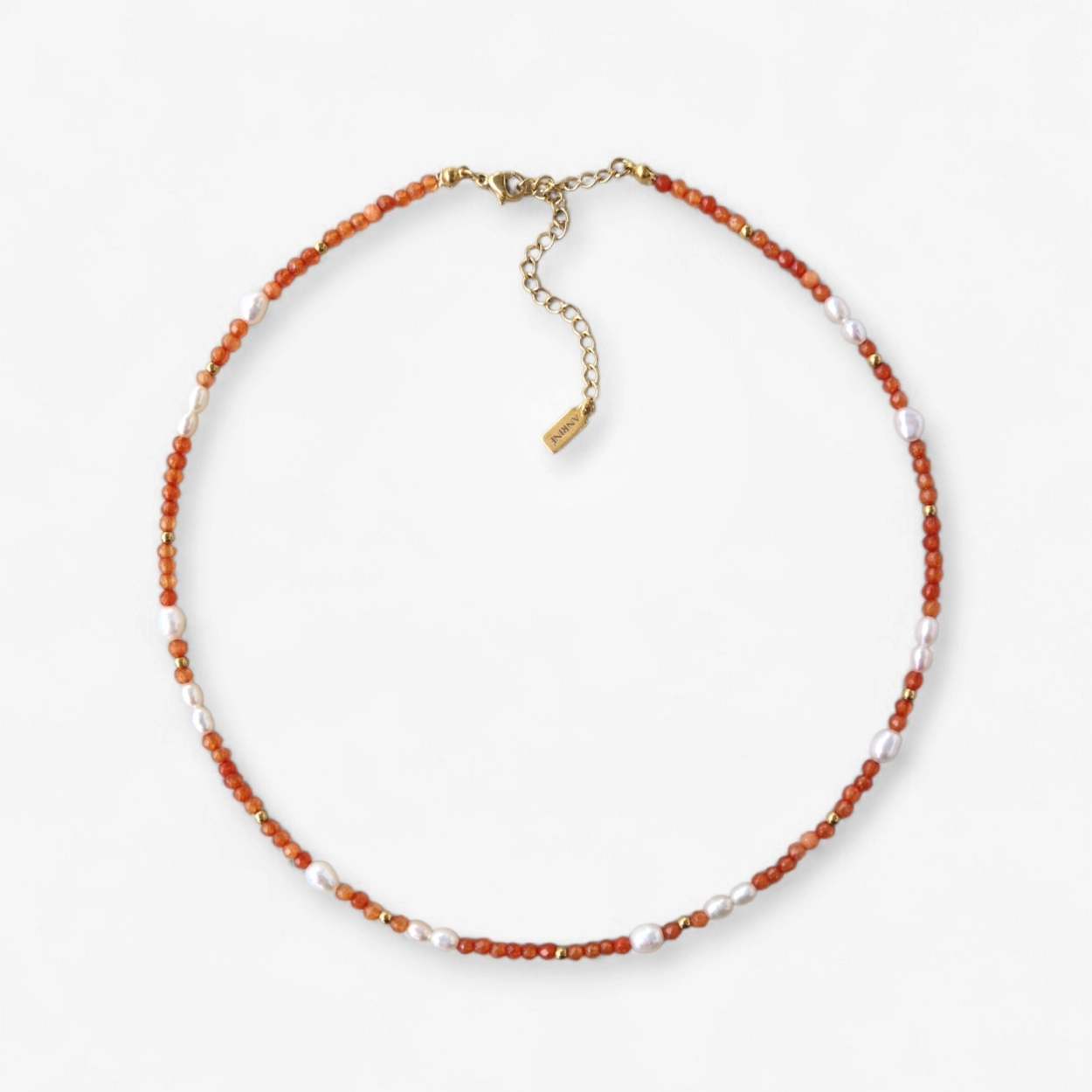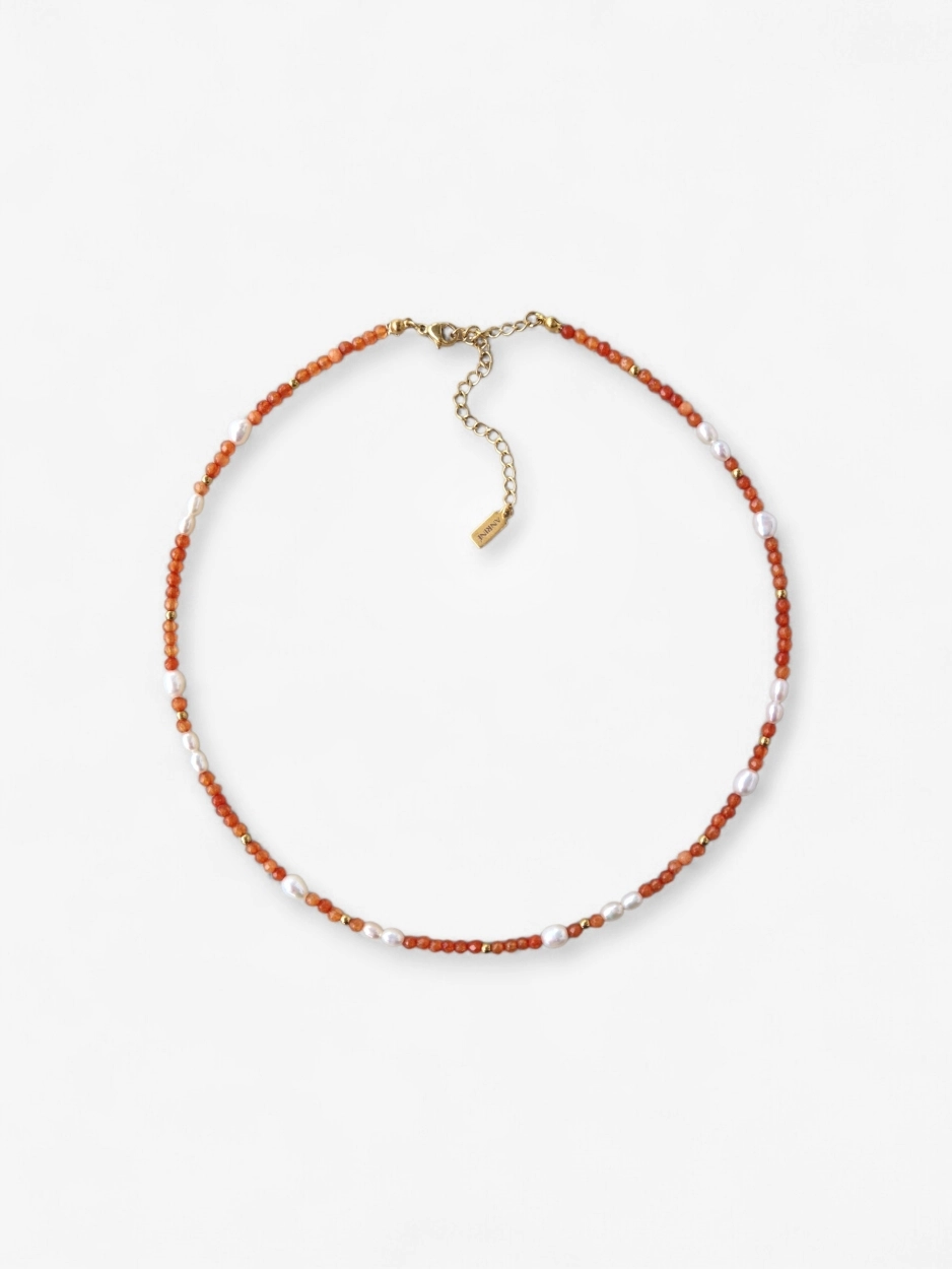 Ένα μίνιμαλ και διαχρονικό κολιέ που συνδυάζει αρμονικά ημιπολύτιμες πορτοκαλί πέτρες, πέρλες γλυκού νερού και λεπτομέρειες από αιματίτη.